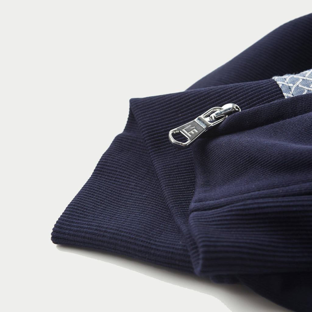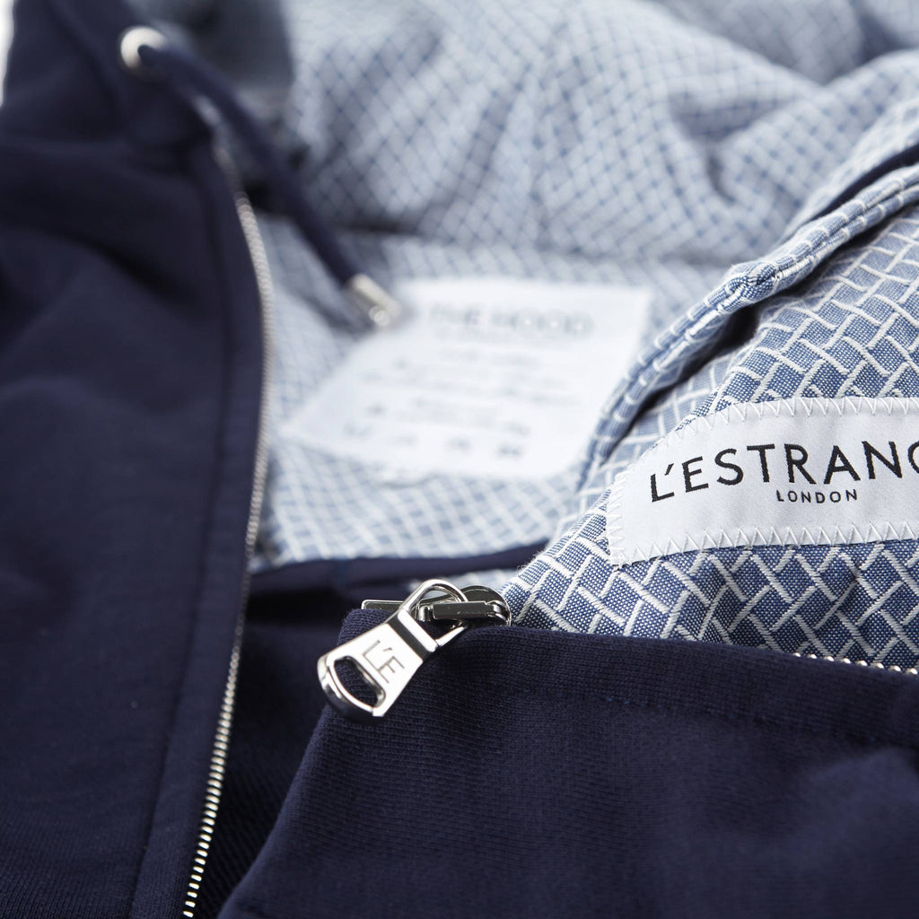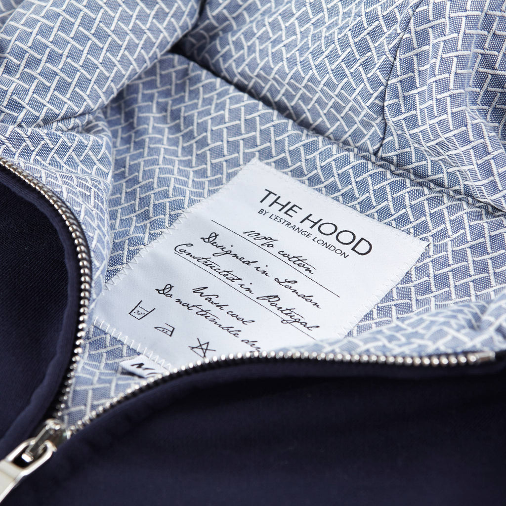 The Hood is our take on the zip-up hooded sweatshirt. The Japanese Cross, Navy is constructed using super-soft navy cotton jersey and lined with a luxurious lawn cotton lining.