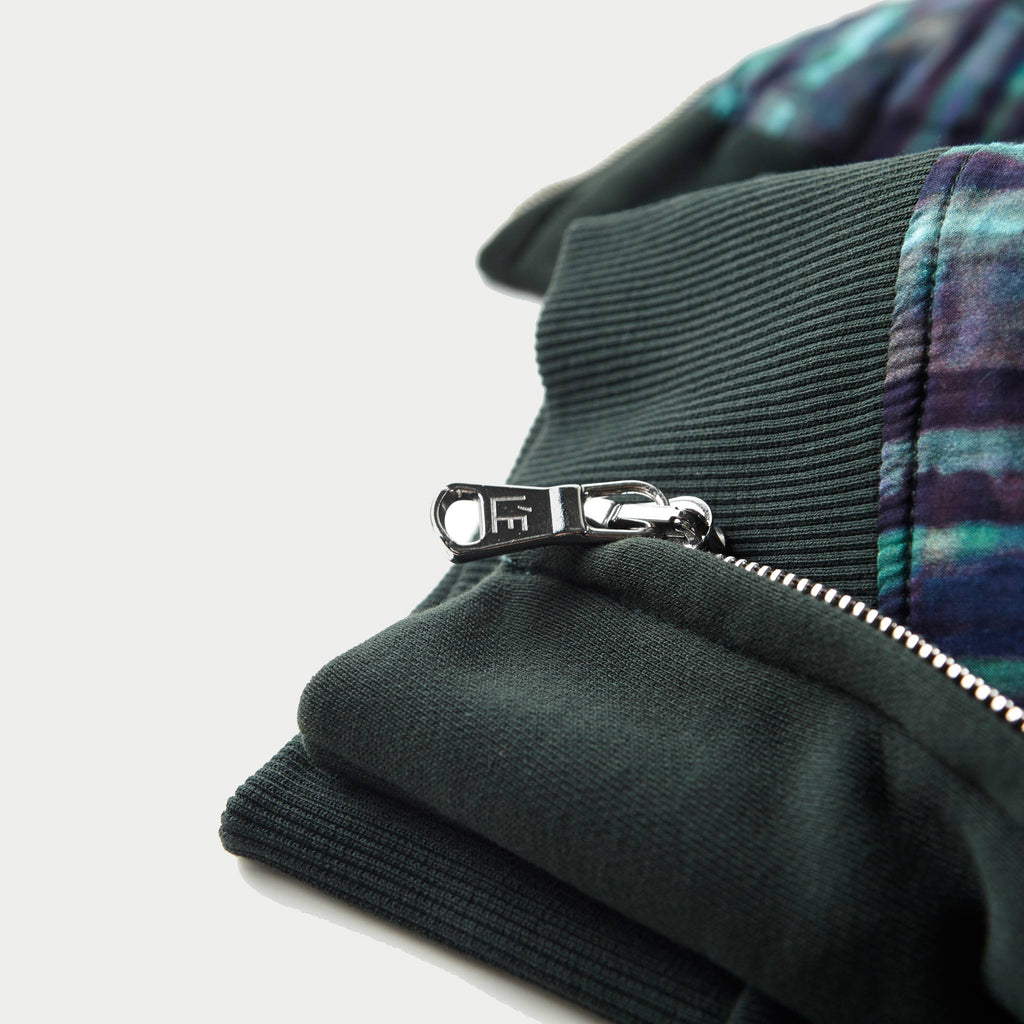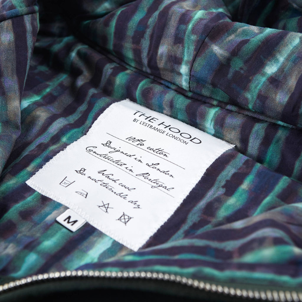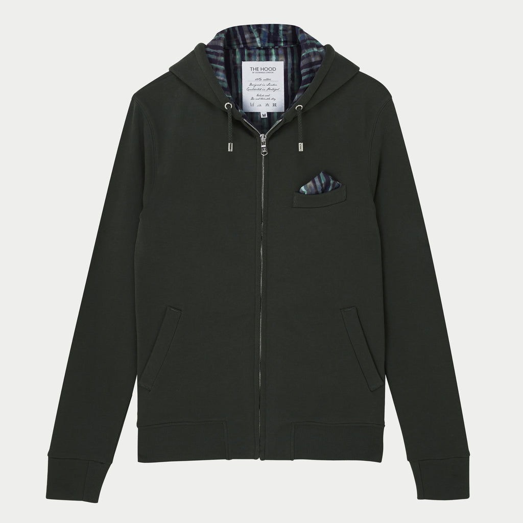 The Hood is our take on the zip-up hooded sweatshirt. The Mirage Print, Green is constructed using super-soft green cotton jersey and lined with a luxurious lawn cotton lining.