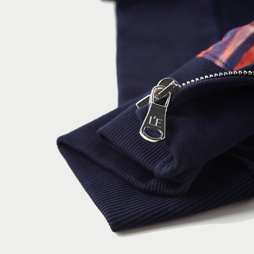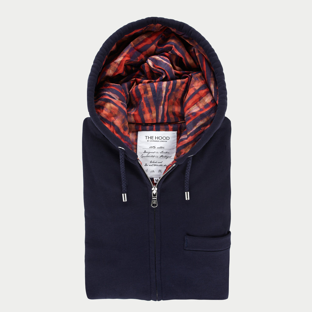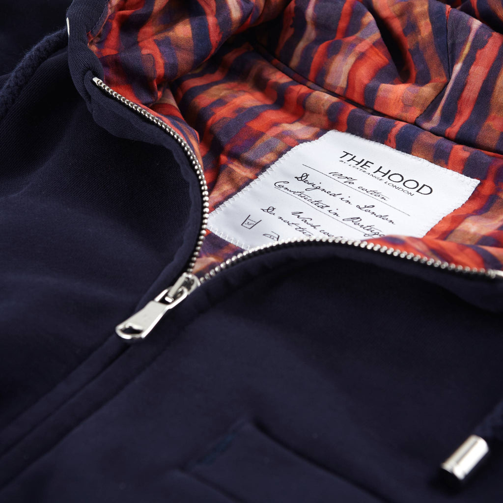 The Hood is our take on the zip-up hooded sweatshirt. The Mirage Print, Navy is constructed using super-soft navy cotton jersey and lined with a luxurious lawn cotton lining.